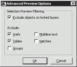 · в области Selection Preview Effect – задать эффект просмотра выбранных объектов: Dash – пунктиром, Thicken – с приданием толщины, Both – оба варианта. Кнопка Advanced Options загружает диалоговое окно Advanced Preview Options (рис. 3.28), позволяющее настроить дополнительные параметры и настроить фильтр просмотра выбранных объектов: Exclude objects on locked layers – исключить объекты на заблокированных слоях. Исключить: Xrefs – внешние ссылки, Tables – таблицы, Groups – группы, Multiline text – многострочный текст, Hatches – штриховки;