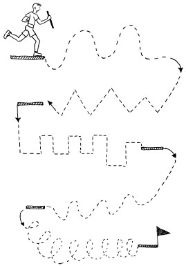 – Ребенка просят провести фигурную дорожку, соединив линию штриховки. При прохождении дорожки ребенку следует стараться как можно более точно следовать всем изгибам и поворотам линий.