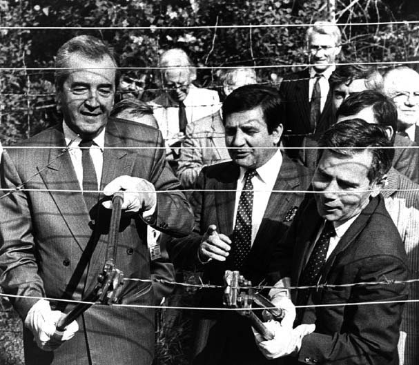 This became clear on 27 June 1989, in a graphic image that rapidly made its way around the globe: two men, smartly dressed in business suits but standing in open country, wielded bolt cutters to nip holes in a rusty barbed-wire fence. The duo – Hungarian foreign minister Gyula Horn and his Austrian counterpart Alois Mock had travelled specially to the Austria–Hungary border to send a deliberate signal. Side by side, cutting through the wire fence, they seemed to be conveying the good news that the division of post-war Europe was coming to an end.