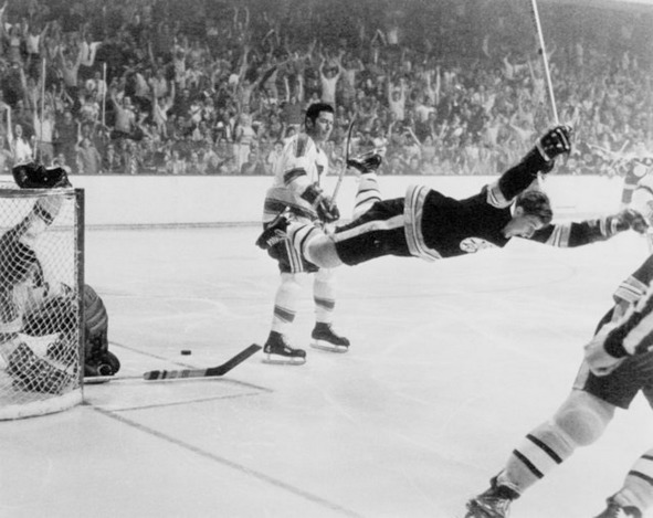 «Летающий» Бобби Орр забрасывает шайбу в ворота S.L. Blues. В воротах – Гленн Холл. Самая легендарная шайба за всю историю розыгрыша Кубка Лорда Стэнли!