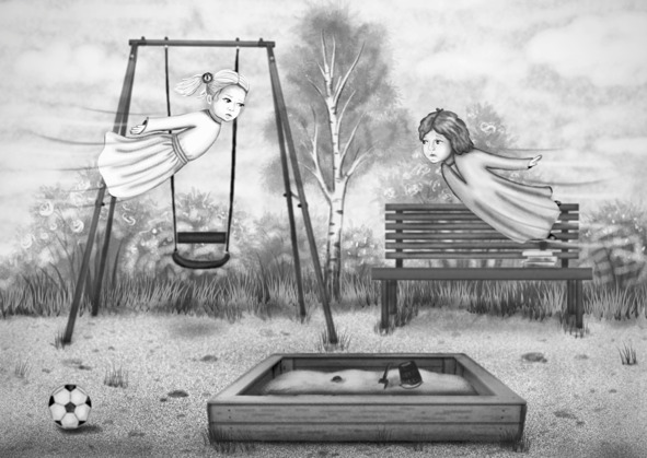 Неожиданно их внимание привлёк плач девочки на детской площадке. Они подлетели поближе. Мама успокаивала дочку. «Давай вместе искать твой совочек!» – говорила она. На детской площадке было много детей. Все играли. А совочек девочка где-то оставила, и не могла вспомнить, где именно. Она каталась на качелях, играла в песочнице, а где лежит её совочек ярко-красного цвета – не знала. Они с мамой ходили по площадке и искали его.