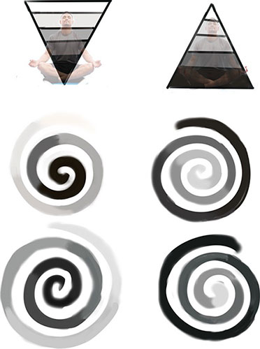 Сегодня, зайдя в класс, я увидела Старца и Архангелов, сидящих в позе лотоса, и присоединилась к ним. Передо мной открылась следующая картина: от копчика к животу у всех присутствующих поднималась чёрная энергия, которая становилась все светлее выше по телу. Это выглядело так, будто человека поместили внутрь треугольника. Причём у Высшего Учителя я увидела перевёрнутый треугольник, а у других – стоящий на основании.
