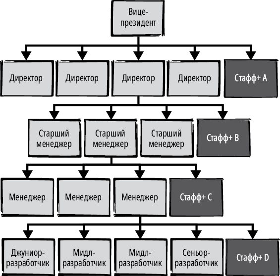 Место в структуре организацииПока что в нашей отрасли у стафф+ разработчиков нет общепринятого места в иерархии должностей. В некоторых компаниях самые старшие разработчики подчиняются главному архитектору или команде технического директора; в других компаниях стафф+ разработчики подчиняются директорам разных структурных подразделений, или менеджерам разных уровней, или вообще и тем и другим одновременно. Здесь нет одного правильного варианта, но есть много неправильных, и все зависит от поставленных целей.
