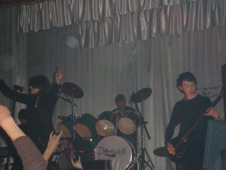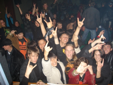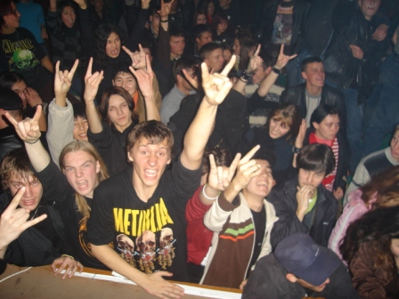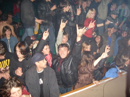И вот! Барабанная дробь! К ДК начинает стекаться народ. Хаирастые мальчишки и девчонки, обвешанные бряцающими цепями и подогретые любимыми спиртными напитками проходят в зал и пытаются понять, как им колбаситься среди кресел )))