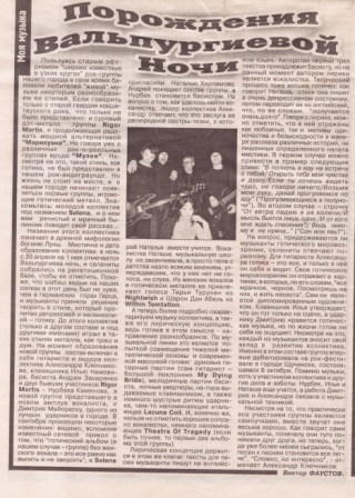 Пользуясь старым афоризмом, «широко известные в узких кругах», рок-группы нашего города в свое время баловали любителей «живой» музыки некоторым разнообразием ее стилей. Если говорить только о старой гвардии кокшетауского рока, что только не было представлено: и суровый дэт-металл группы Rigor Mortis и продолжающая радовать мощной альтернативой «Марихуана». Не говоря уже о различных рок-н-рольных группах вроде «Музея». Несмотря на это, такой стиль, как готика, не был представлен в нашем рок-андеграунде. Но жизнь не стоит на месте, и в нашем городе начинают появляться первые группы, играющие готический металл. Знакомьтесь: молодой коллектив под названием Selena, и о нем вам речистый и мрачный былинник поведет свой рассказ…