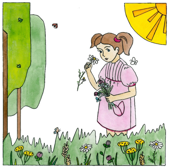 By the time mother finished her story, Verochka had already been standing in the clearing. Mother sat down on a stump to have a rest, and the girl began collecting flowers for the bouquet. They were various flowers that she was picking: camomiles, clovers, dandelions, and other flowers that Vera didn’t know much about.