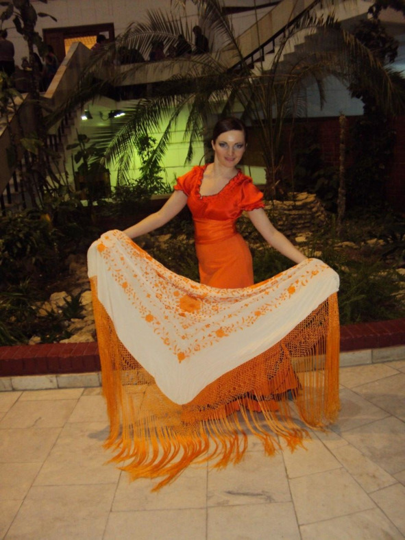 – Этот Мантон – Манильская шелковая шаль – большой квадратный платок, украшенный вышитыми фантастическими птицами, обрамленный по всему периметру бахромой из шелковых нитей. Она дарует своей обладательнице крылья, являясь продолжением её тела и движений.