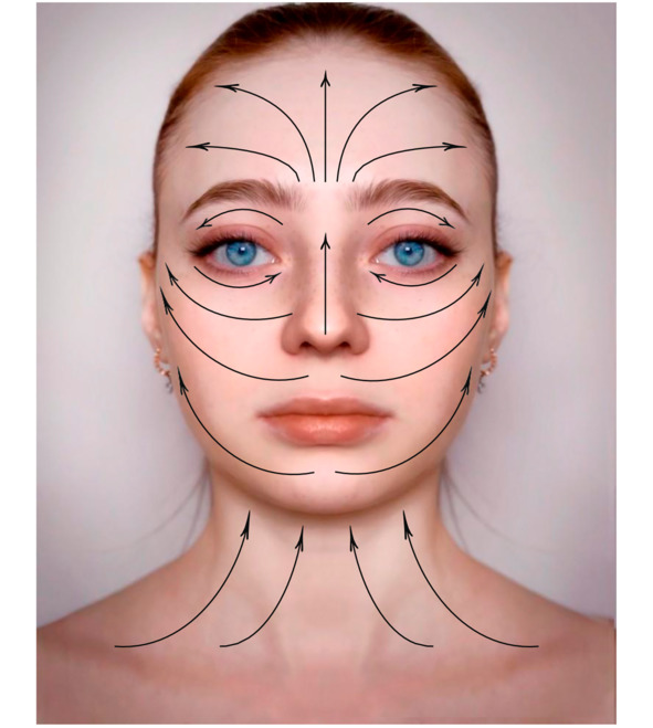 На всех этапах подготовки кожи к макияжу двигайтесь по массажным линиям вверх от центра к периферии.