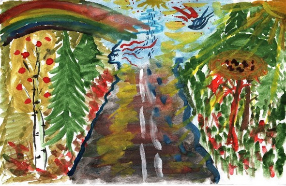 – Здравствуй, смелая Веточка, – молвил Источник человеческим голосом. – Как прекрасно, что ты осмелилась на это путешествие. Действительно, ты можешь помочь своему родному дереву возродиться. Только одну каплю воды из моего источника ты можешь взять и её будет достаточно, чтобы дерево твоё снова расцвело и вернуло себе силу, здоровье и могущество. Однако помни, что сберечь ты каплю должна, до дерева донести и корням его отдать, иначе всё зря будет: и сама умрешь и дерево к жизни не вернешь. Поняли друзья свою задачу и пустились Лазоревка с Веточкой в обратный путь.