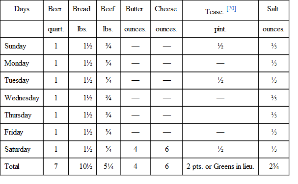 The ration for the greater period appears to have been beef ¾ lb., bread ½ lb., cabbage 1 lb., or a supply of pease; Wednesdays or Fridays, herrings or cod substituted for the meat, and a pound of potatoes.