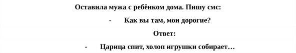 Жена обещала сюрприз. Говорит, отвернитесь и сосчитайте до10. Отвернулись, посчитали, оборачиваемся. Жены нет, на столе записка: «Я ушла в салон красоты. Телефон не взяла. Каша на плите. Вернусь через четыре часа. Приятного выходного.