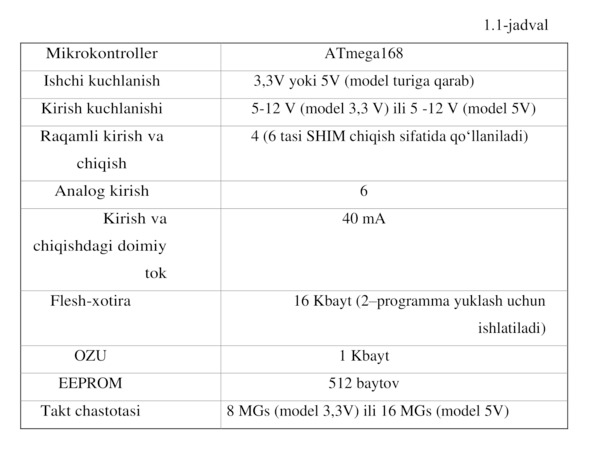 1.1-jadvalda Pro Mini Arduino platasining xarakteristikalari keltirilgan.