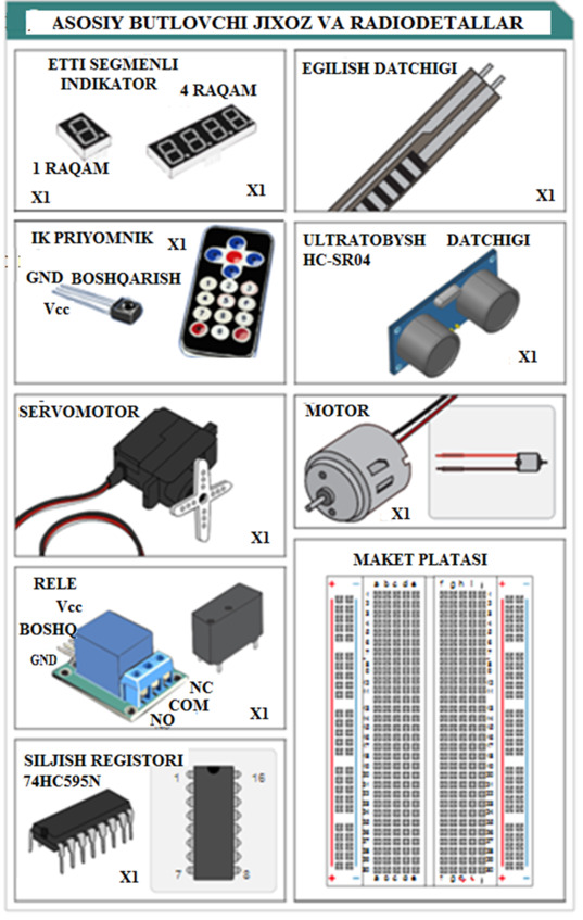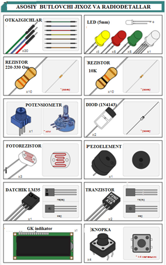 3.3-rasmda Arduinoda keng qo’llaniladigan asosiy butlovchi detallar-ulovchi simlar, LED svetodiodlari, rezistorlar, potensiometr, diod, fotorezistor, tranzistor, yetti segmentli element, knopka, servo motor, rele, ultrasonik, maket platasi va boshqalar keltirilgan (3.7-rasm).