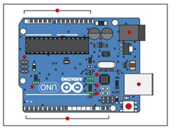 Arduinoning elektron bloki hozirgi zamonaviy kompyuterning «Ona» platasini analogi hisoblanadi. Unda tashqi qurilmalarni ulash uchun uyachalar (razyomlar) va mikrokontrollerni programmalashtirish uchun kompyuter bilan bog‘lovchi ulovchi USB kabel mavjud.