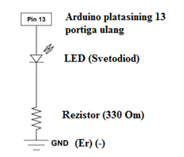 LED inglizchasiga (light-emitting diodes) bo‘lib, o‘zbekchasiga yorug‘lik diodi, ko‘plab qurilmalarda qo‘llaniladi. Arduino UNO asosida birinchi miltillovchi yorug‘lik diodi asosida tajribani ko‘rib chiqamiz. Ko‘p loyihalarni bajarish mumkin bo‘lgan Arduino UNO platasida yorug‘lik diodini vaqt bo‘yicha miltillashini tajribada bajaramiz. Tajriba uchun detallarni tanlaymiz va ishga kirishamiz. 4.2, 4.3, 4.4, 4.5 – rasmlarda birinchi tajribaning prinsipial sxemasi, radiodetallarning joylashishi, sxemaga detallarni ulanishi keltirilgan.