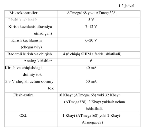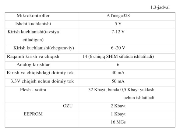UNO Arduino platasining xarakteristikalari 1.3-jadvalda keltirilgan.
