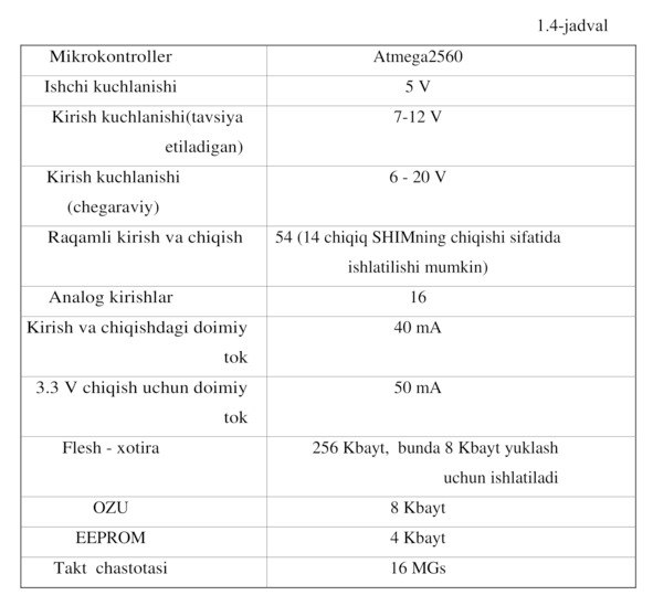 Mega Arduino platasining xarakteristikalari 1.4-jadvalda keltirilgan.