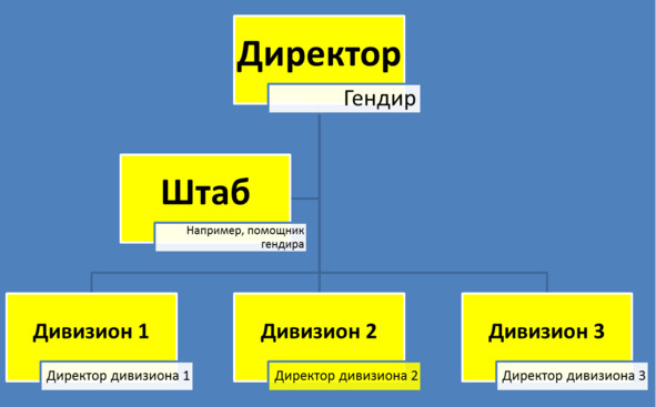 В то же время, часто недооценивается определенное нарушения принципа единоначалия в продуктовой структуре, обычно его рассматривают лишь на примере сложных матричных организационных структур. Это не правильно. Дело в том, что в крупной организации, которая пошла на дробление функциональной структуры, всегда остаются чисто функциональные блоки на уровне всей корпорации, например, корпоративные финансы. В результате продуктовое подразделение кроме высшего руководителя получает еще дополнительных руководителей в лице функциональный работников высшего эшелона управления. 18
