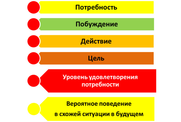 Итак, повторим – процесс мотивации описывается подпроцессами: Потребность – Побуждение – Движение к цели (для удовлетворения потребности) – Достижение цели – Удовлетворенность – Оценка уровня удовлетворенности – Вероятное поведение в будущем.