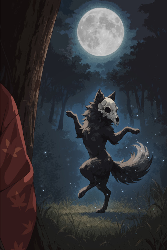 Животное в маске из человеческого черепа кружилось и подпрыгивало, грациозно взмахивая хвостом. Череп то вытягивался в звериный, то вновь обретал человеческие черты, переливаясь голубым светом. Черный мех мерцал серебром под полной луной, а маска придавала лисице вид жуткого, величественного демона.