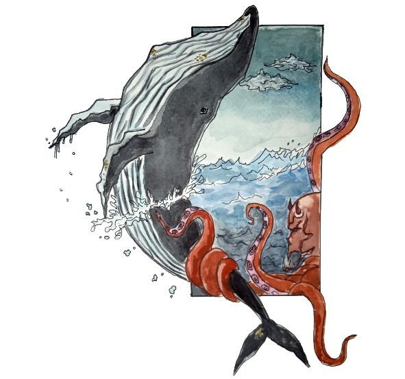 Видит Грушенька, что чем больше путник рубит, тем больше из воды появляется щупалец. Бросилась она ему на помощь. Увидела у Чудища место незащищенное, отодвинула чешуйку, а там лежит сосуд в виде сердца. Схватила она сосуд и побежала со всех ног на кита, а путник за ней.