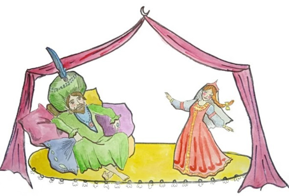 Разошлись жёны по своим покоям, а Султан велит привести к нему любимую наложницу. Побежали слуги к старшей жене Султана, пали ей в ноги, попросили защиты. А старшая жена самая хитрая была, взяла балалаечку и пошла к Султану в покои, чтобы порадовать супруга музыкой и песнями, чтобы больше никогда он не вспомнил о любимой наложнице.