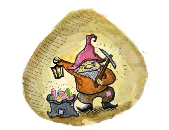 Стоят перед ним гномы, за плечами мешки доверху набитые чем-то, а в руках у каждого кирка золотая. Гномы были добытчики знатные, добывали они самоцветы, серебро и золото.