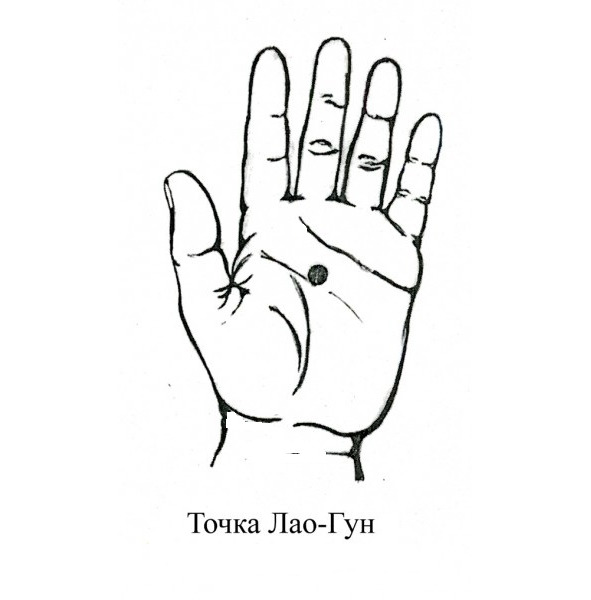 В самом центре ладони есть точка, которая у китайцев называется лао гун – дворец труда. Если раздвинуть пальцы и провести биссектрису между указательным пальцем и средним, а потом провести мысленно линию, соединяющую кончики большого пальца и мизинца, то примерно на пересечении этих двух линий и будет точка Лао Гун.