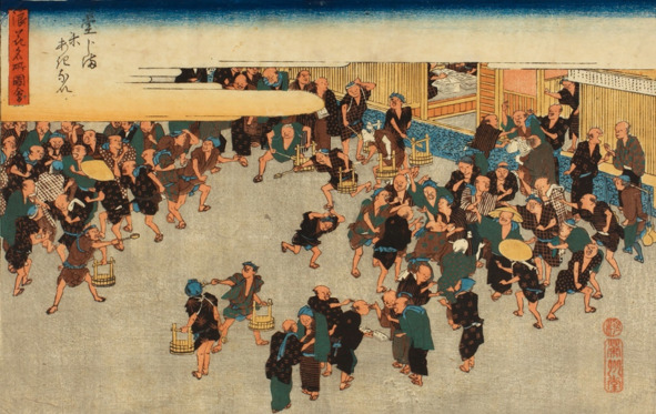 Картина «Рисовая биржа Додзима» известного средневекового художника Хирошиге (1797—1858). Хранится в Осакской библиотеке Наканошима