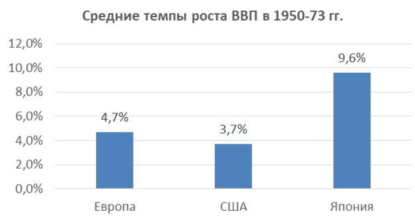 Согласно статистическим данным, средние ежегодные темпы роста Японии в период с 1950 по 1973 годы составляли 9,6%85. Для сравнения темпы роста США составляли 3,7%, а роста стран Европы 4,7%.
