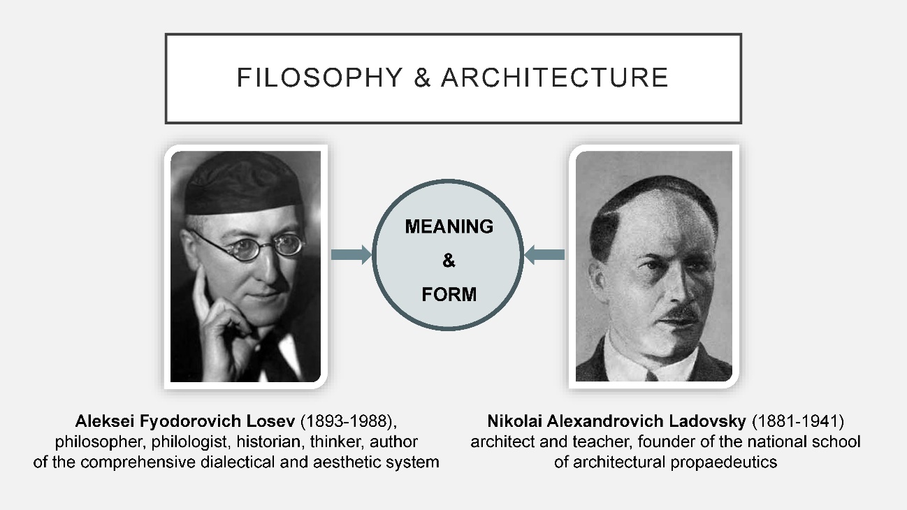 The same 20s and 30s of the last century saw the birth of fruitful and integral concepts: the one by Nikolai Ladovsky in architecture and pedagogy, and the other by Aleksei Losev in aesthetics and philosophy. Architectural propaedeutics is dynamic and open to new syntheses with philosophical thought. Our task is to show how abstract thought can nourish concrete aesthetics, dialectical philosophy can become a generator of principles for architectural pedagogy, and, perhaps more importantly, to produce an emerging branch of the new architectural aesthetics based not on manifesto negations of past experience, but on the powerful message of the all-unity of Vladimir Solovyov and the supreme synthesis of Aleksei Losev.