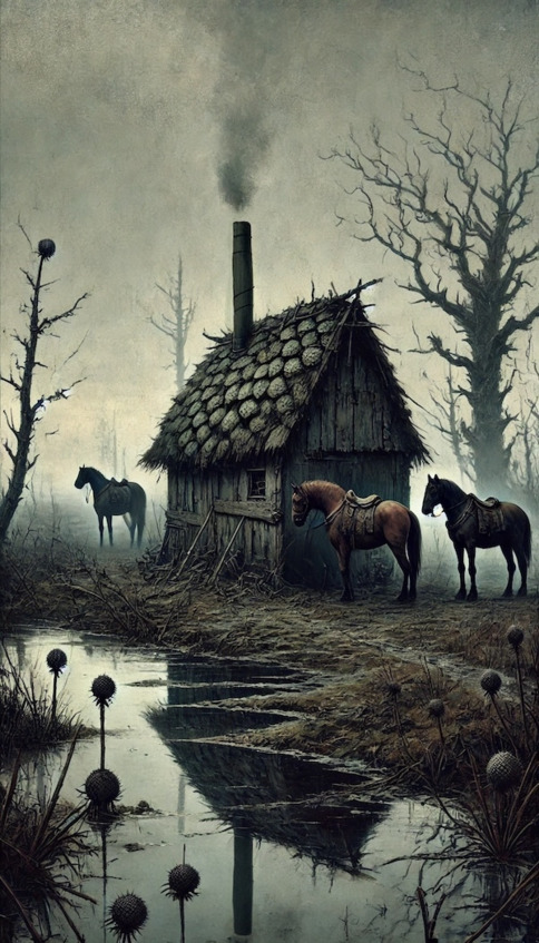 Прямо перед хижиной, в нескольких шагах от порога, стояли лошади. Крупные, с темной, покрытой грязью шерстью, они выглядели уставшими, будто их гнали без отдыха. С них спустились четверо мужчин. От одного вида у меня перехватило дыхание. Двое были закованы в железную чешую – потемневшую, со старыми вмятинами. На головах – легкие железные шапки, открывавшие лица и поблескивавшие в тусклом утреннем свете. За спинами висели круглые деревянные щиты, обитые железом – небольшие, крепкие, но побитые по краям. В руках они держали оружие: у одного был боевой молот с короткой ручкой, у другого – топор с широким лезвием.