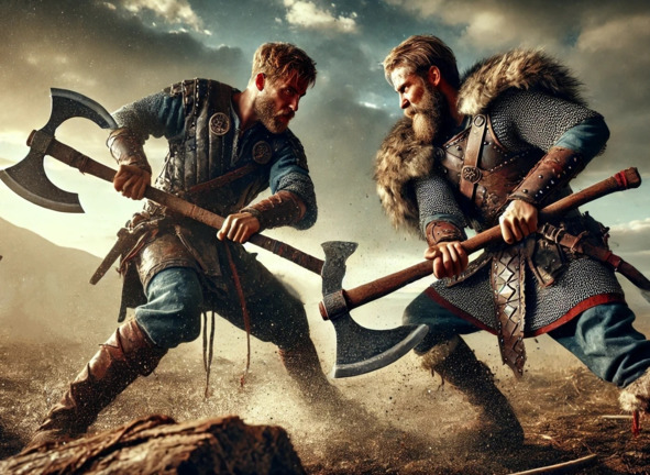 Насколько земли там богатыУзнали викинги теперь.Сдав ярлу кубки, вазы, латыРогнар добыл всё без потерь.Ярл долго гневаться не могНа самоволие вассала.Тот популярен стал как богИ золота отдал немало.С Рогнаром все хотят в поход,Но с ярлом ссориться опасно.Пришел просить ярла народИ оказалось не напрасно.Лотброка он в поход пустилИ дал побольше кораблей.Чтоб золото не утаилВ команды ввел своих людей…Опять на вновь открытый островОтряды викингов напали.Всё получилось очень простоИ мирные селенья пали.Большой добычей загрузились,И по холмам в обратный путь.К стоянке кораблей спустились,А тут засада – не свернуть.Ведь люди короля не спали.Засаду возле кораблей,Они так грамотно создали,Чтоб варвары увязли в ней.Грянула битва. Боже правый.Воюют с радостью причём.Берсеркер* с топором кровавыйИль дева юная с мечом.Их натиск словно пламя жарокСквозь хруст поломанных костей.А смерть – лишь Одину подарокПод стоны раненых людей…Не выдержав неистового бояВойска бежали с побережья прочь.У викингов – занятие иноеОни с добычей уплывали в ночь.4. Поединок