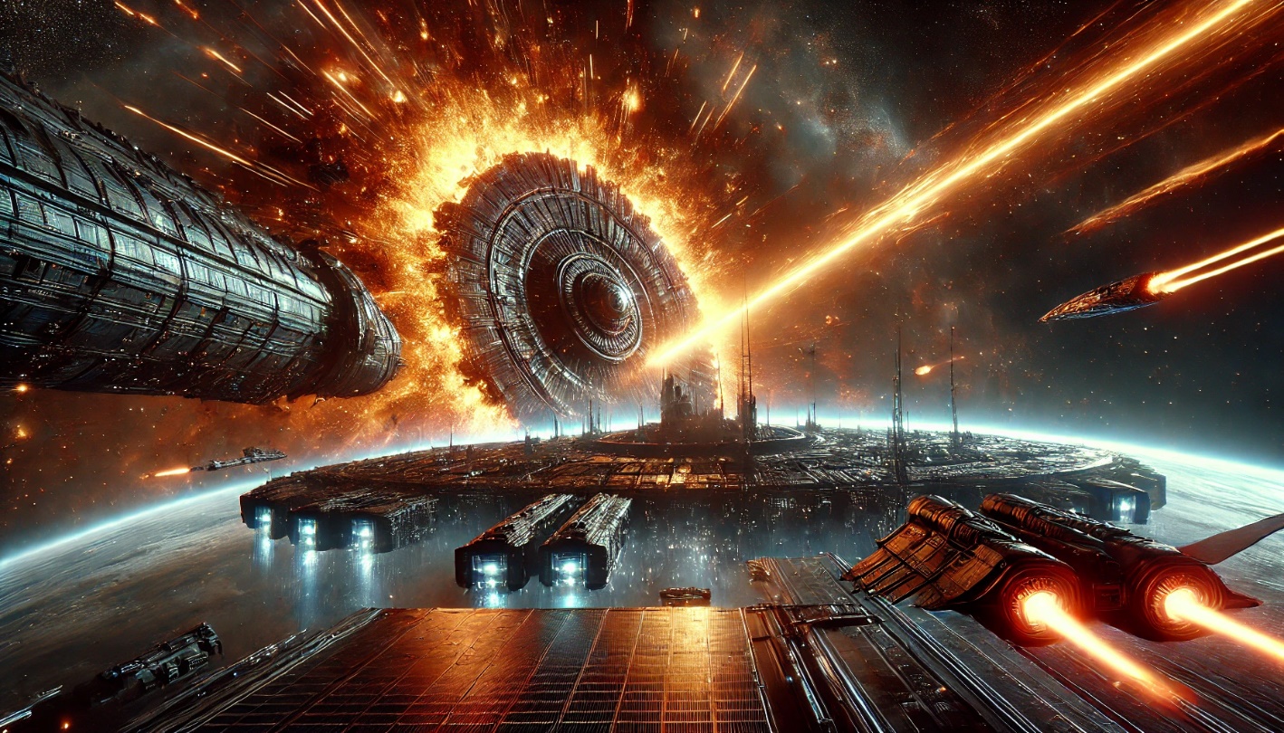 Пространство между станцией и крепостью вспыхивало ослепительными вспышками пуска ракет и торпед. Каждый пуск оставлял после себя медленно рассеивающийся след и мириады искр, похожих на космических светлячков. Эти искры, рождённые в горниле сражения, на мгновение освещали древнюю броню станции, покрытую таинственными руническими знаками.
