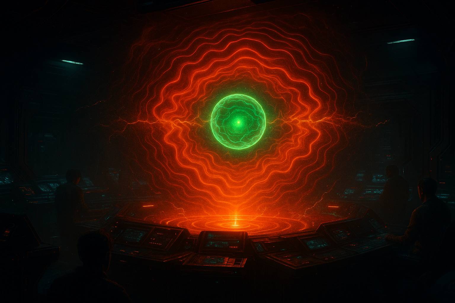 Далее стали происходить невероятные вещи – воздух в командном центре словно застыл. Над центральным голографическим проектором зависло пульсирующее изображение – абстрактная композиция из кроваво-оранжевых волн, в центре которых сжимался и расширялся фосфоресцирующий зелёный шар. Его ритмичные пульсации напоминали биение неведомого сердца, а с каждым "ударом" по помещению расходились слабые волны статического электричества, от которых на коже выступали мурашки.