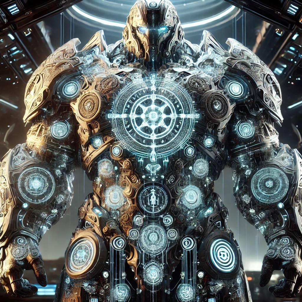 Перед ними, занимая добрую треть командного зала, стояла голограмма великана. Трёхметровый исполин в доспехах из материала, напоминавшего жидкий металл, переливавшийся всеми оттенками, стали и бронзы. Каждая пластина его лат была покрыта замысловатыми руническими узорами, которые слабо светились изнутри.