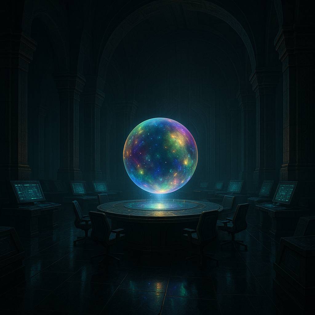 В центре медленно вращался шар, переливающийся всеми цветами радуги. Его поверхность то становилась прозрачной, открывая взору целые галактики внутри, то снова превращалась в мерцающую сферу.