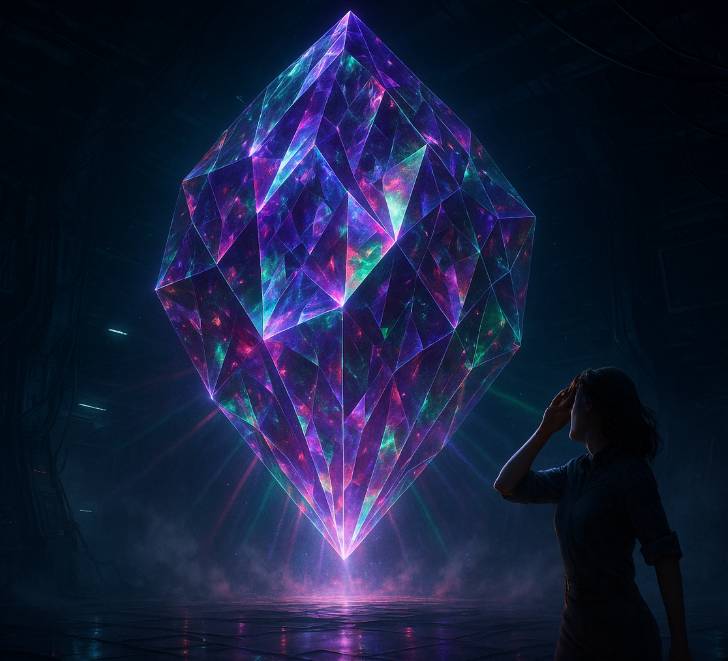 На голограмме появился кристалл, но уже не тот, что лежал перед ней на столе. Нет. Этот был гигантским, сверкающим тысячами граней, каждая из которых переливалась разными цветами: фиолетовым, зелёным, багряным. Он напоминал живую конструкцию, как будто был частью чего-то гораздо большего.