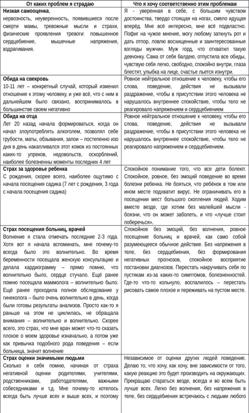 – Отличная работа: подробная таблица, ясные, развёрнутые формулировки! Теперь самостоятельно напиши не менее 100 хочух без ограничений. Т.е. всем внутренним критикам, которые будут отрицать возможность твоих желаний, отвечаешь: «Ведь записать-то я могу!»