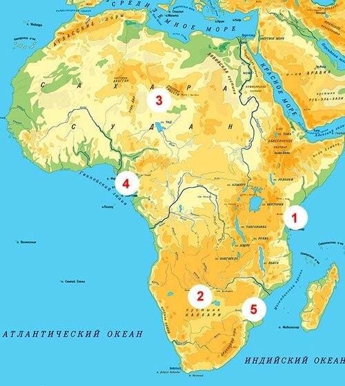Занзибар (1) – это танзанийский остров у Восточного побережья Африки, Калахари (2) – пустыня на юге Африке, Сахара (3) – тоже пустыня, но на севере континента, Фернандо-По (4) – вулкан на острове Биоко, высшая точка государства Экваториальная Гвинея, а пресловутое Лимпопо (5) – это река на юго-востоке Африки.