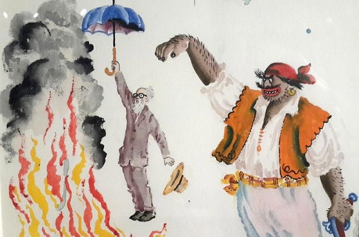Дело в том, что именно художник Добужинский в каком-то смысле пробудил к жизни и Айболита, и его вечного антагониста Бармалея. Как рассказывает наш известный лингвист Лев Успенский в книге «Имя дома твоего», по словам самого Корнея Ивановича Чуковского, его главный поэтический цикл зародился довольно забавным образом. Много лет назад поэт в компании с Добужинским гулял по Петроградской стороне, и в какой-то момент они вышли на Бармалееву улицу. Название привлекло внимание, и художник поинтересовался – кто же такой был этот Бармалей. Чуковский начал рассуждать о возможной этимологии, но нетерпеливый художник его перебил: «Неправда! – сказал он. – Я знаю, кто был Бармалей. Он был страшный разбойник. Вот как он выглядел…» И на листке Добужинский набросал свирепого злодея, бородатого и усатого… Через какое-то время у Чуковского вышла новая книжка с названием «Бармалей» и, естественно, с рисунками Мстислава Добужинского. Именно оттуда, из первого издания, и взято это изображение.