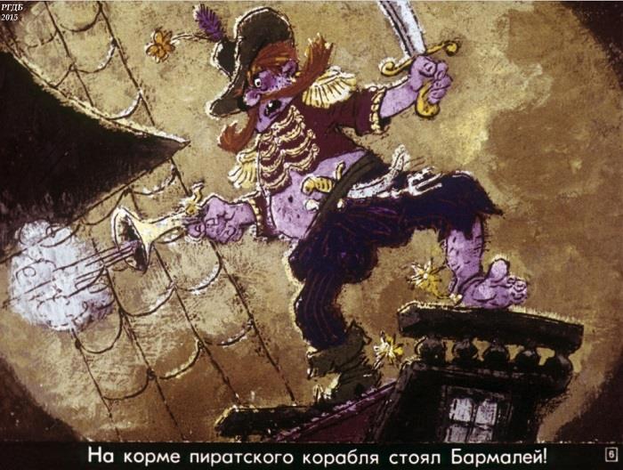 Пусть Добужинский персонажу и отец родной, но с обликом Айболита – не угадал. Такое бывает. А вот с Бармалеем, напротив – угадал. В тексте сказки нигде не упоминается, что Бармалей – пират, у Чуковского он всего лишь людоед (да, да, каннибал, Чуковский вообще очень добрый детский писатель) и разбойник. Но Добужинский почему-то изобразил его пиратом, и вот уже почти столетие «кровожадный и беспощадный» не снимает униформы морских разбойников. Пришлось даже Чуковскому много позже, в прозаической версии «Доктора Айболита» как-то разъяснить пиратское происхождение знаменитого разбойника.
