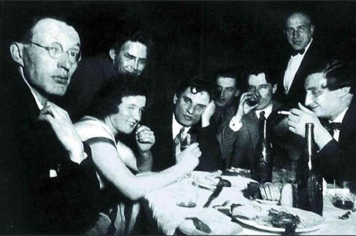 А вот сотрудники газеты "Гудок" в ресторане ВЦСПС в 1927 г. Олеша подпер голову рукой, со стаканом – Валентин Катаев, между ними – Евгений Петров.
