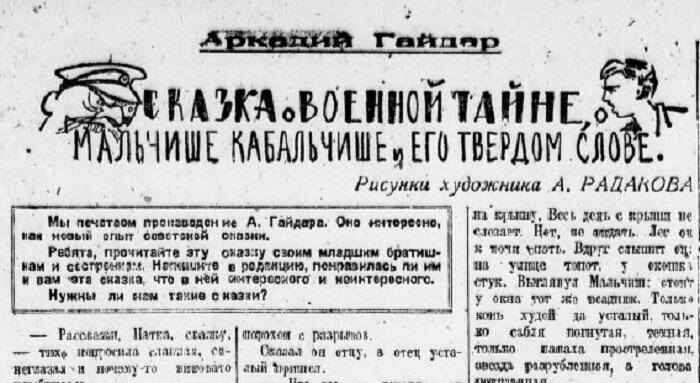 "Мы печатаем произведение А. Гайдара. Оно интересно, как новый опыт советской сказки. Ребята, прочитайте эту сказку своим младшим братишкам и сестренкам. Напишите в редакцию, понравилась ли им и вам эта сказка, что в ней интересного и неинтересного. Нужны ли нам такие сказки?".