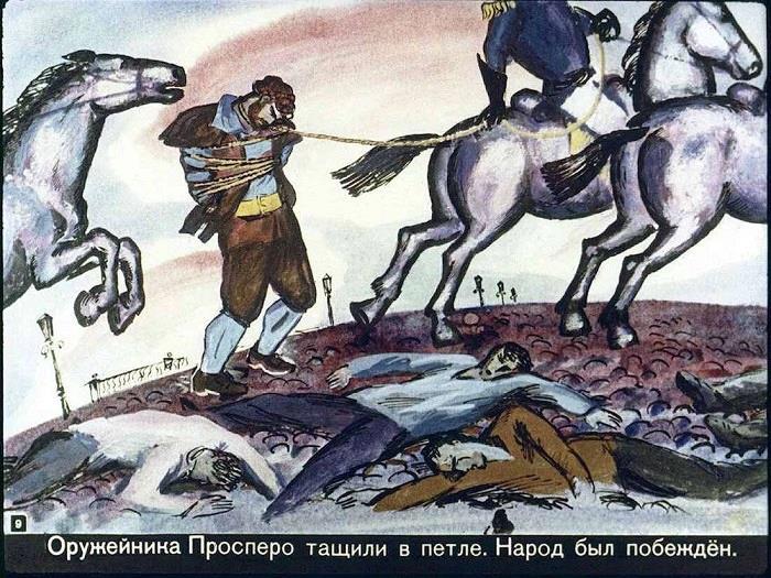 Доктор Гаспар увидел на зеленом пространстве множество людей. Они бежали к городу. Они удирали. Издалека люди казались разноцветными флажками. Гвардейцы на лошадях гнались за народом.