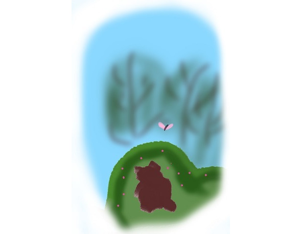 Медвежонок наклонился к одному из самых необычных цветков. Он был разноцветным, его нижняя часть была похожа на ромашку голубого цвета, а верхняя состояла всего из двух больших лепестков с розовыми пятнышками на желтом фоне. Тошка хотел, уже было понюхать цветок, как вдруг! Два больших лепестка взлетели вверх и полетели в сторону леса. Это была бабочка, и медвежонок поспешил за ней. Бабочка залетела в лес, Тошка бежал за ней стараясь разглядеть всю красоту которая проносилась по бокам, листья папоротника, птички с разноцветными перышками, сидевшие на ветках деревьев, шишки на ветках и на земле, кусты с яркими красными ягодами… Бабочка взлетела выше, Тошка стараясь не упустить её из вида, смотрел ей в след, не останавливаясь, и вдруг он врезался во что-то мягкое и бурчащее. Это был «бурый» медвежонок, который кушал малину, срывая её с куста.