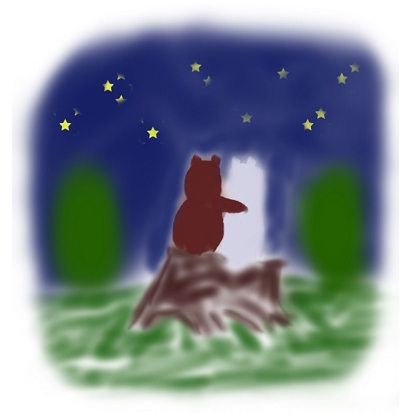 Когда он подошёл к старому большому пню, на котором они с Потапом сидели и любовались звёздами вчера вечером, он понял, что не знает где живет Потап и сел на пенёк в надежде, что Потап скоро придёт. Тошка сидел и думал: как хорошо, что его льдина приплыла именно к этому острову, где он нашёл настоящего друга, а ещё о том насколько разнообразный и красивый может быть мир. Он сидел и думал, как вдруг… сзади него что-то зашевелилось и зашуршало. Тошка обернулся и увидел, как шевелится куча листьев и оттуда появилась мордочка Потапа.
