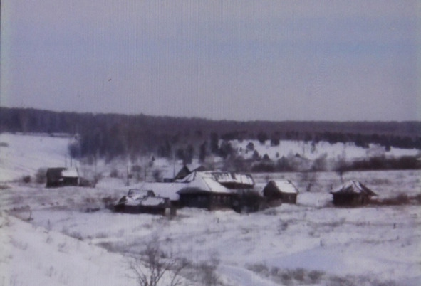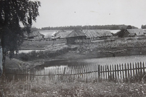 На фотографии вид от озера на деревню, видны оставшиеся постройки.