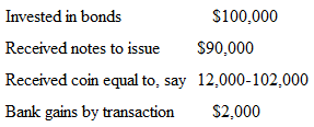 Take a bank with one hundred thousand dollars to invest in government bonds as a basis for its issuance of currency. The bonds were bought with the depreciated Treasury notes. Deposited with the Comptroller of the Currency at Washington, the bank received ninety thousand dollars of notes to issue as money. It also received six thousand dollars in coin as one year’s advance interest upon its deposited bonds, under the law of March 17, 1884. This coin, not being available for use as money, was sold or converted into Treasury notes at a ratio of from two to two and a half for one. The bank, therefore, had received, as a working cash capital, a sum in excess of the money invested in its bonds. The transaction stands as follows: