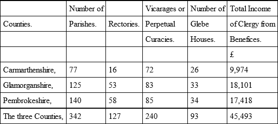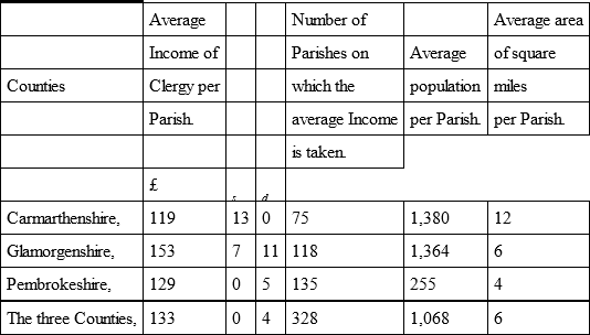 "There is a great and general deficiency of voluntary funds for the maintenance of schools for the poor in the rural parts of South Wales. By far the most liberal contributors to such schools in England are the clergy. The following table exhibits the clerical income of the beneficed clergy in my district. I would beg to call particular attention to the average area and population of the parishes in Carmarthenshire, and to the income of the clergy in the remote hundreds of Dewisland and Kemess: —